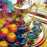 The primary forces in my work are colour and light. Whether creating a traditional landscape, exploring and capturing the negative spaces in a thicket of undergrowth or a forest of trees, studying the play of light and reflection on inanimate objects, colour and light make me swoon and yearn to portray their power and beauty. I use oil and acrylic on canvas; watercolour, gouache and coloured pencil on watercolour paper in my endeavour to capture movement, depth, life and light.